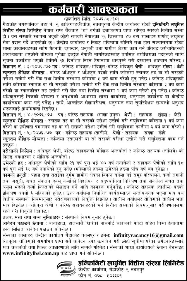 काठमाडौं । इन्फिनीटि लघुवित्त वित्तीय संस्थाले विभिन्न पदका लागि कर्मचारीको माग गरेको छ । संस्थाले कनिष्ठ अधिकृत अधिकृत वरिष्ठ अधिकृतका लागि केही, वरिष्ठ सहायकका लागि केही, कनिष्ठ सहायकका लागि केही लागि केही कर्मचारीको माग गरिएको जनाएको छ ।