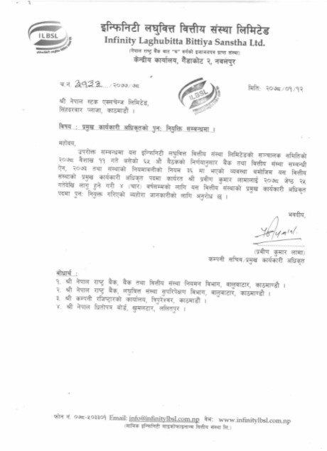 काठमाडौं । इन्फिनिटी लघुवित्त वित्तीयको प्रमुख कार्यकारी अधिकृत (सिईओ) मा प्रवीण कुमार लामा पुनः नियुक्ती भएका छन् ।लघुवित्तको बैशाख ११ गते सम्पन्न ६५ औं बैठकले लामालाई जेठ देखि लागू हुनेगरी सिईओ पदमा पुनः नियुक्ती गर्ने निर्णय गरेको हो ।