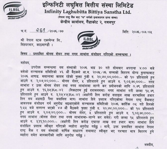 इन्फिनिटीले यसअघि बोनस, नगद र कर तिर्नसमेत गरी १५ दशमलव ७९ प्रतिशत लाभांश वितरण गर्ने जनाएको थियो । अब यसमा थोरै घटाएर १५ प्रतिशत लाभांश दिइने भएको छ ।