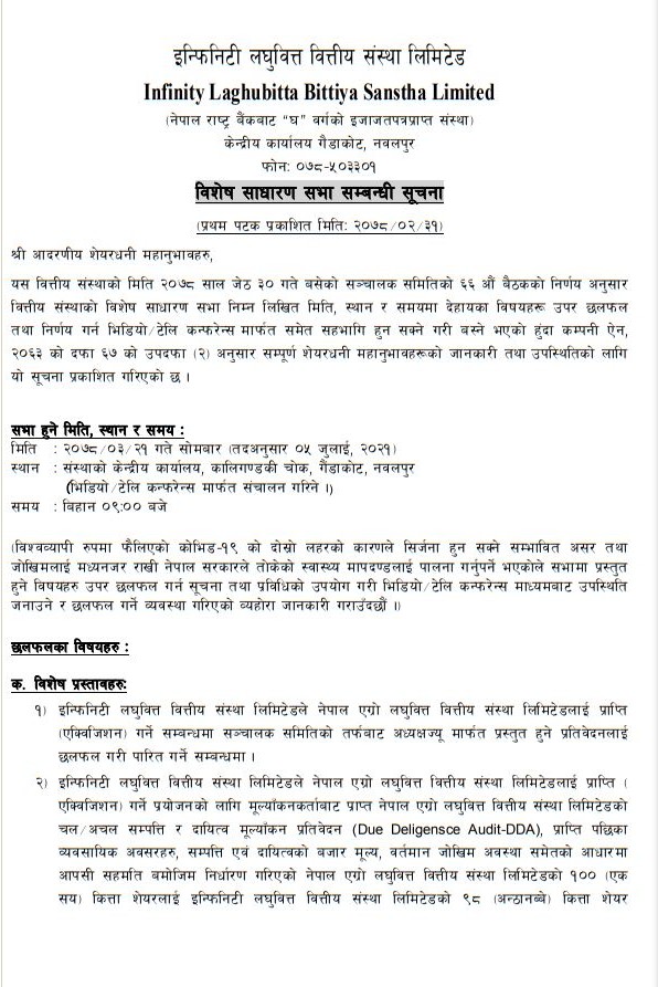 काठमाडौं । इन्फिनिटी लघुवित्त वित्तीय संस्था लिमिटेडले असार २१ गते विशेष साधारण सभा आह्वान गरेको छ । सभा संस्थाको केन्द्रीय कार्यालय, कालिगण्डकी चोक, गैंडाकोट नवलपुरमा बिहान ९ बजे सुरु हुने संस्थाले जनाएको छ । संस्थाको जेठ ३० गते बसेको संचालक समितिको बैठकले उक्त सभाको मिति तय गरेको हो ।