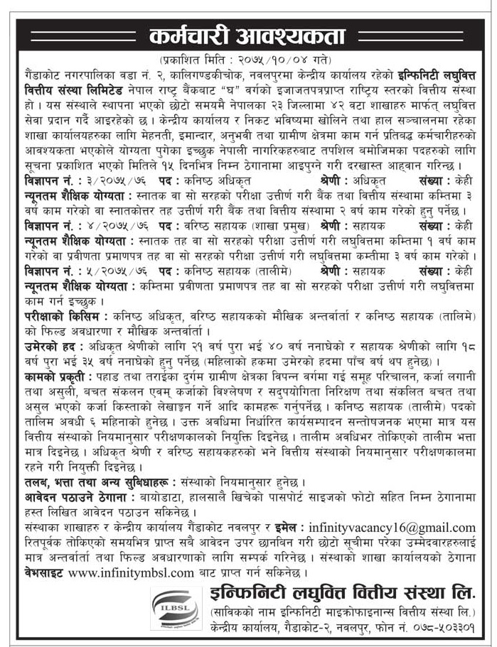 इन्फिनिटी लघुवित्त वित्तीय संस्थाले केन्द्रिय कार्यालय तथा शाखा कार्यालयहरुका लागि केही संख्यामा कर्मचारीहरु माग गरेको छ । लघुवित्तले कनिष्ठ अधिकृत पदका लागि केही, वरिष्ठ सहायक शाखा प्रमुख पदका लागि केही र सहायक पदका लागि केही संख्यामा कर्मचारीहरु माग गरेको हो ।