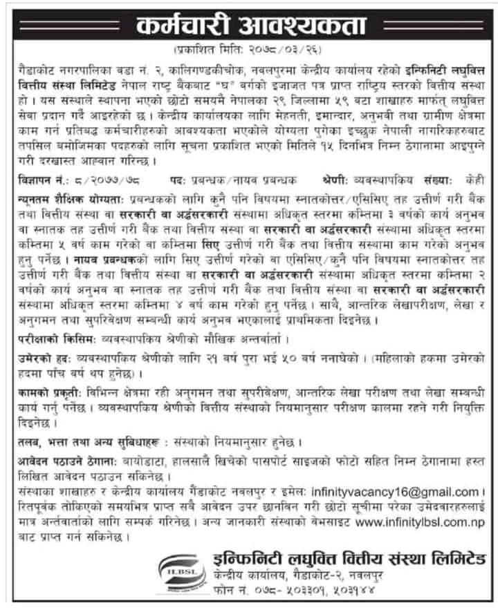 काठमाडौं । इन्फिनिटी लघुवित्त वित्तीय संस्थाले कर्मचारीको माग गरेको छ । संस्थाले प्रबन्धक र नायब प्रबन्धकका लागि केही संख्यामा कर्मचारीको माग गरेको जनाएको छ । संस्थाले स्नाकोत्र गरेको तथा वित्तीय क्षेत्रमा काम गरेको अनुभवी योग्यता भएको व्यक्ति चाहिने जनाएको छ ।