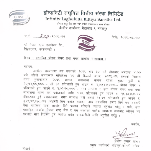 इन्फिनिटी लघुवित्तले प्रस्ताव गर्यो १५.७९% लाभांश