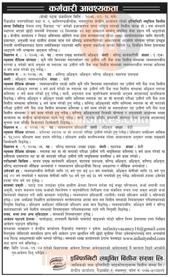 इन्फिनिटी लघुवित्त वित्तीय संस्थाले विभिन्न पदमा कर्मचारी माग गरेको छ । लघुवित्तले नायव प्रमुख कार्यकारी अधिकृत १ जना, कनिष्ठ अधिकृत, व्यवश्थापन प्रशिक्षार्थी र वरिष्ठ सहायक पदमा केही कर्मचारी माग गरेको हो।