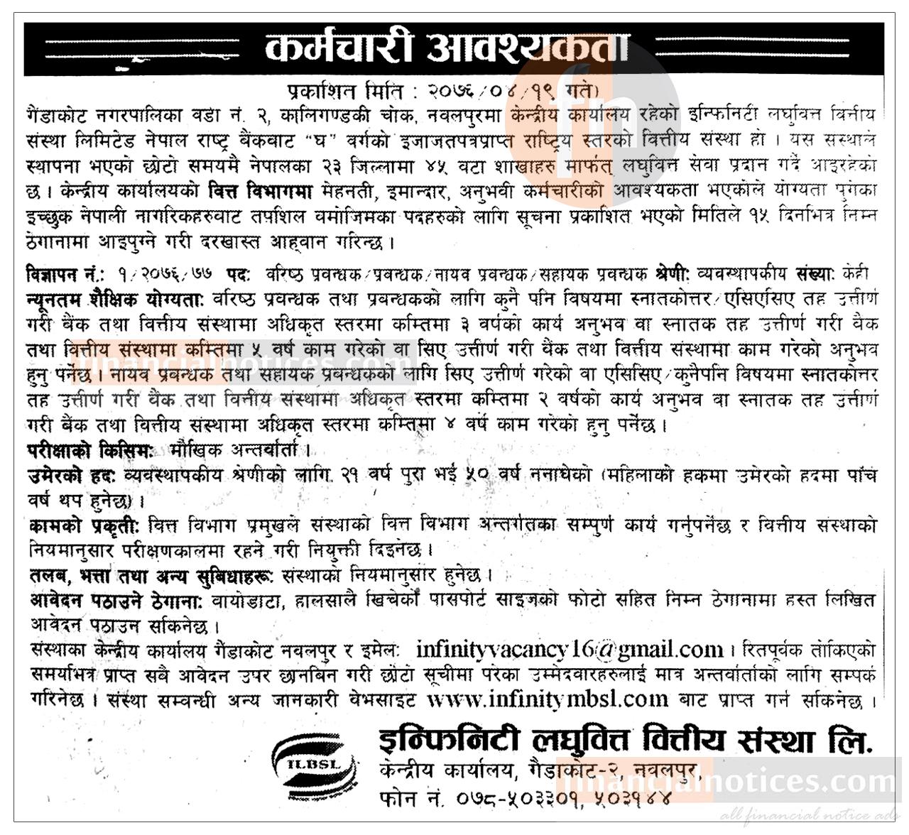 इन्फिनिटी लघुवित्त वित्तीय संस्थाले कर्मचारी माग गरेको छ । संस्थाले वरिष्ठ प्रबन्धक/ प्रबन्धक /नायव प्रबन्धक/ सहायक प्रबन्धक पदमा केही कर्मचारी माग गरेको हो ।