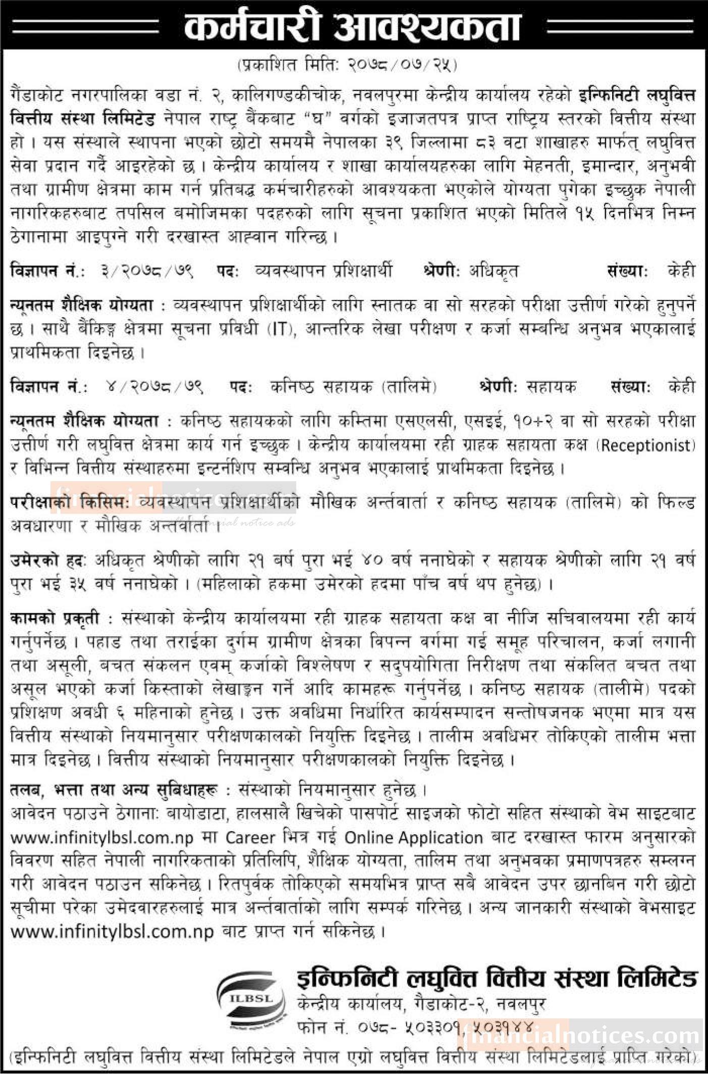 काठमाडौं । इन्फिनिटी लघुवित्त वित्तीय संस्था लिमिटेडले विभिन्न पदका लागि कर्मचारीको माग गरेको छ । कम्पनीले व्यवस्थापन प्रशिक्षार्थीका लागि केही र अधिकृतका लागि, कनिष्ठ सहायक तालिमेका लागि केही र सहायकका लागि केही संख्यामा कर्मचारी माग गरेको हो ।