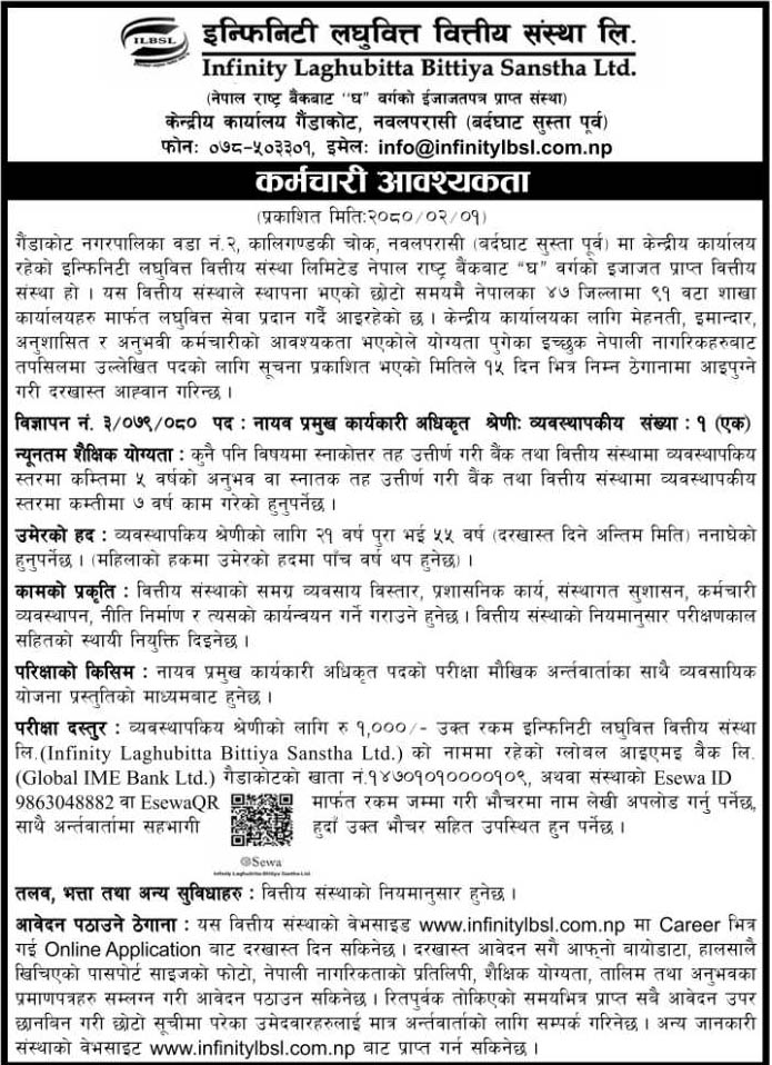 काठमाडौं । इन्फिनिटी लघुवित्त वित्तीय संस्था लिमिटेडले नायव प्रमुख कार्यकारी अधिकृत (डिसीइओ) माग गरेको छ । संस्थाले उक्त पदमा आवेदन दिनको लागि मान्यता प्राप्त शैक्षिक संस्थाबाट स्नाकोत्तर तह उत्तिर्ण गरेको हुनुपर्ने जनाएको छ । साथै, बैक तथा वित्तीय क्षेत्रमा कम्तिम ५ वर्ष सम्म काम गरेको अनुभव हुनुपर्ने जनाएको छ । २१ वर्ष पुरा भई ५५ वर्ष ननाघेको हुनुपर्नेछ । ईच्छुक तथा योग्यता पुगेका उम्मेदवारले संस्थाको वेवसाईट मार्फत सुचना प्रकाशित भएको मितिले १५ दिनभित्र आवेदन दिनुपर्नेछ ।