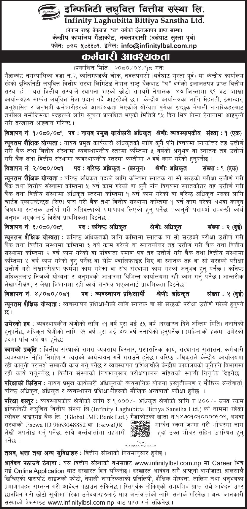 संस्थाले नायब प्रमुख कार्यकारी अधिकृतका लागि १ जना, वरिष्ठ अधिकृतका लागि १ जना, कनिष्ठ अधिकृतका लागि दुई र अधिकृतका लागि २ जना कर्मचारी माग गरेको हो । उक्त पदको लागि शैक्षिक योग्यता स्नाकोत्तर तह देखि स्नातक तहसम्म अध्यन गरेको र बैंक तथा वित्तीय संस्थामा कार्य अनुभव भएको हुनुपर्नेछ ।