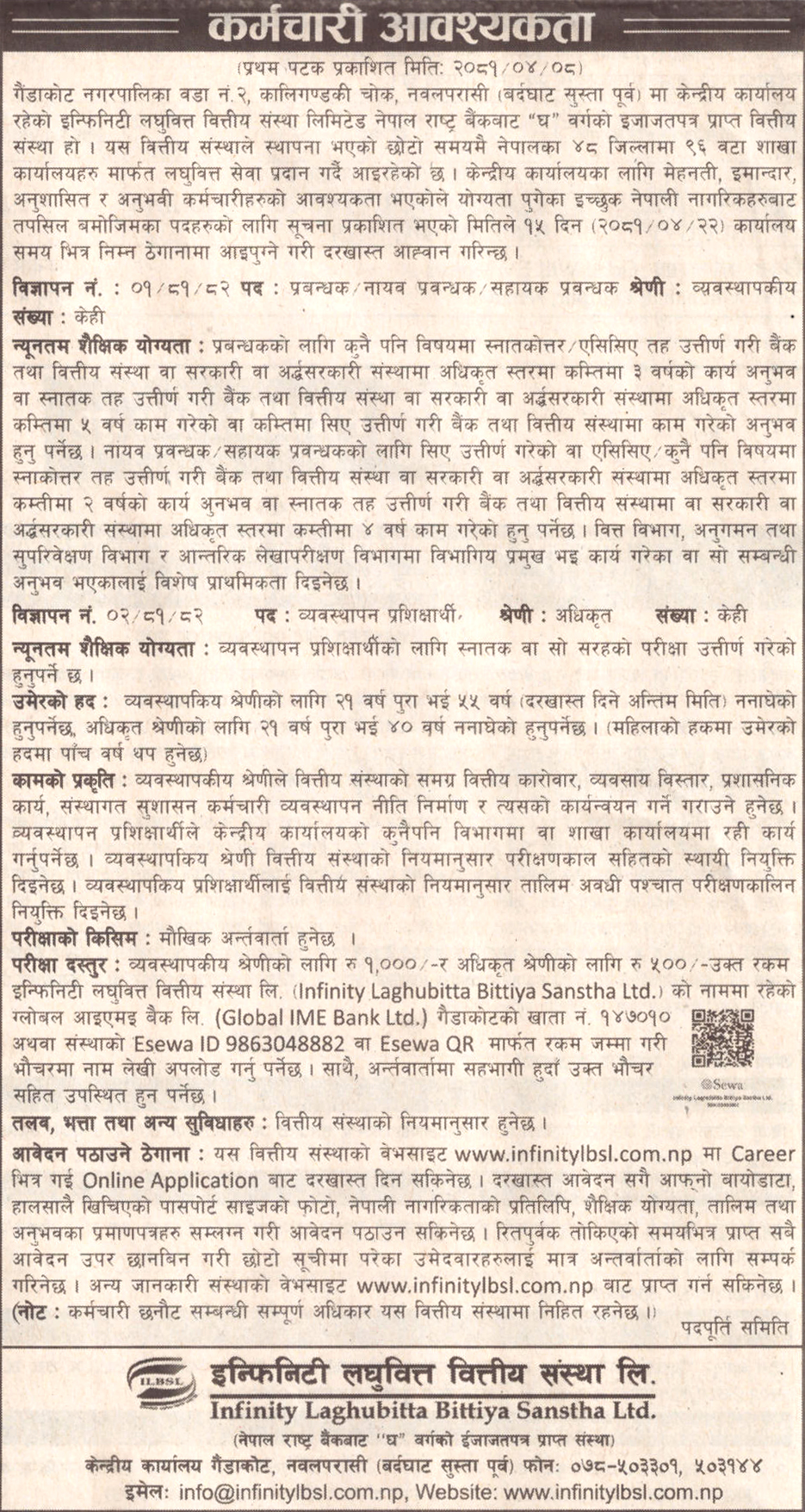 काठमाडौं । इन्फिनिटी लघुवित्त वित्तीय संस्था लिमिटेडले विभिन्न पदको लागि कर्मचारी माग गरेको छ । कम्पनीले प्रबन्धक, नायव प्रबन्धक, सहायक प्रबन्धक पदको व्यवस्थापकीय श्रेणीका लागि केही र व्यवस्थापन प्रशिक्षार्थीमा अधिकृत श्रेणीका लागिकेही संख्यामा कर्मचारी माग गरेको हो ।