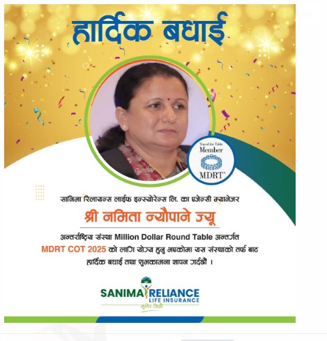 काठमाडौं । सानिमा रिलायन्स लाइफ इन्स्योरेन्सकी चिफ एजेन्सी म्यानेजर नमिता न्यौपाने सन् २०२५ का लागि सीओटी बन्न सफल भएकी छन् । प्रतिकूल अवस्थाका बावजुद पनि नमिताले यो सफलता हात पार्न सफल भएकी हुन् । सन २०२० बाट पटक पटक एमडीआरटी, टीओटी बन्दै आएकी नमिता २०२५ का लागि भने सीओटी बन्न सफल भएकी हुन् । विभिन्न बाधा र चुनौतिलाई छिचोल्दै आफ्नो यात्रामा अडिक रहेकी नमिताले यो सफलता हात पारेकी हुन् ।