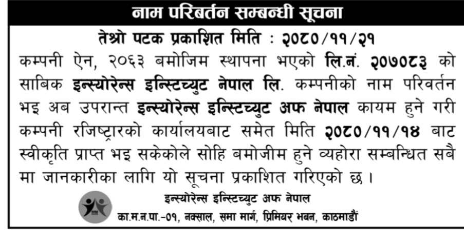 काठमाडौं । इन्स्योरेन्स इन्स्टिच्युट नेपाल लि.को नाम परिवर्तन भएको छ । कम्पनी ऐन २०६३ बमोजिम स्थापना भएको साविक इन्स्योरेन्स इन्स्टिच्युट नेपाल लि.को नाम परिवर्तन भई अब इन्स्योरेन्स इन्स्टिच्युट अफ नेपाल कायम हुने जनाइएको छ । कम्पनी रजिष्ट्रारको कार्यालयबाट फागुन १४ गते स्वीकृत प्राप्त भएको जनाइएको छ ।
