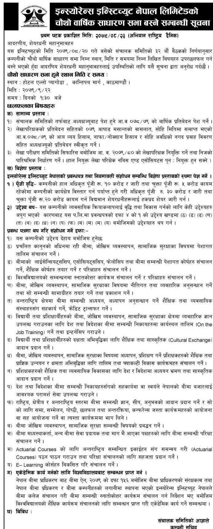 इन्स्टिच्युटले पुस २२ गते चौथो वार्षिक साधारणसभा आयोजना गर्ने भएको छ । कम्पनीले व्यवसायिक क्रियाकलापलाई बृद्धि तथा विकास गर्नका लागि पूँजी बढाउने भएको हो । इन्स्टिच्युटले यसका लागि प्रवन्धपत्रको दफा ४ को एक को उद्देश्य खण्डमा उद्देश्यहरु समेत थप्ने भएको छ ।