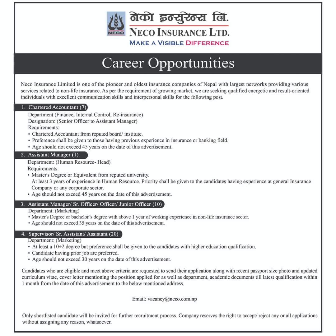 त्यस्तै, नेको इन्स्योरेन्स कम्पनीले चार्टर्ड अकाउन्टेन्टका लागि ७ जना, असिस्टेन्ट म्यानेजरका लागि १ जना, असिस्टेन्ट म्यानेजर, सिनियर अफिसर,अफिसर र जुनियर अफिसरका लागि १० जना र सुपरभाइजरका लागि २० जना कर्मचारीको माग गरेको हो ।