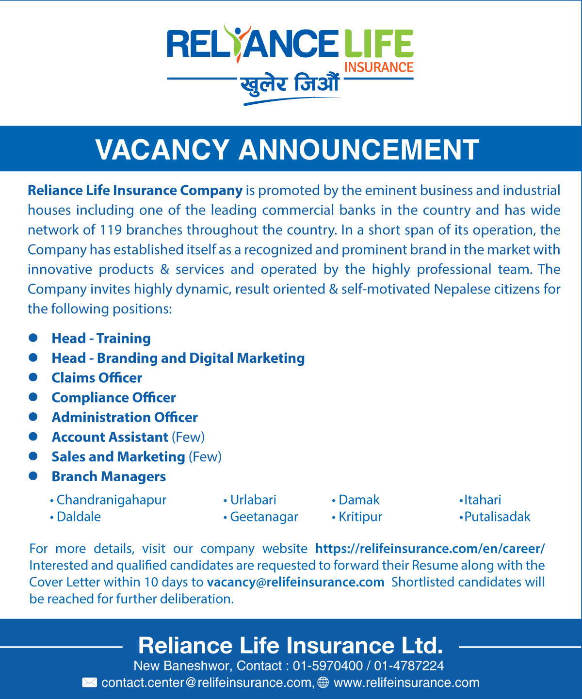 रिलायन्स लाइफ इन्स्योरेन्स कम्पनी लिमिटेडले ८ पदमा कर्मचारीको माग गरेको हो । कम्पनीले हेड–ट्रेनिङ , हेड–ब्रान्डिङ एण्ड डिजिटल मार्केटिङ, क्लेइम अफिसर, कम्प्लियन्स अफिसर, एडमिनिस्ट्रेसन अफिसर, अकाउन्ट असिस्टेन्टका लागि केही, सेल्स एण्ड मार्केटिङका लागि केही संख्यामा कर्मचारी माग गरेको जनाएको छ ।