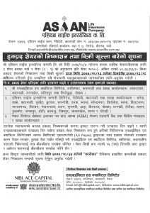 बीमा समितिको निर्देशन बमोजिम २ अर्ब चुक्ता पूँजी पुर्याउने क्रममा एशियन लाइफ इन्स्योरेन्सले फागुन १३ गतेदेखि २ बराबर १ अनुपातमा अर्थात ५० प्रतिशत हकप्रद शेयर बिक्री गर्न लागेको हो ।