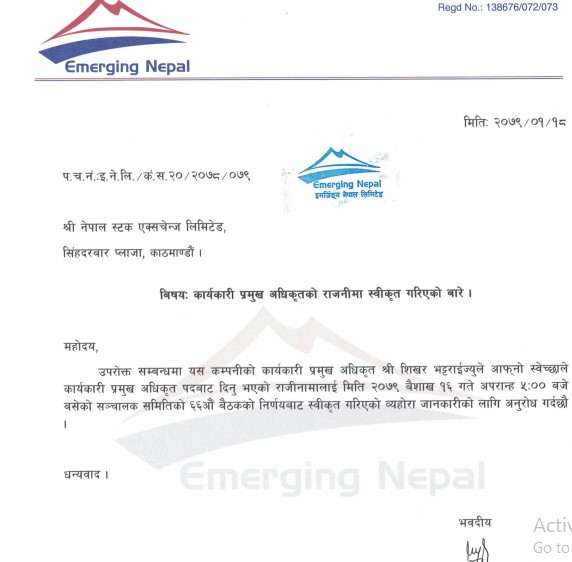 काठमाडौं । इमर्जिङ्ग नेपाल लिमिटेडका प्रमुख कार्यकारी अधिकृत (सीईओ) शिखर भट्टराईले राजीनामा दिएका छन् । कम्पनीको वैशाख १६ गते बसेको सञ्चालक समितिको बैठकले प्रमुख कार्यकारी अधिकृत भट्टराईले दिएको राजीनामा स्वीकृत गरेको हो ।