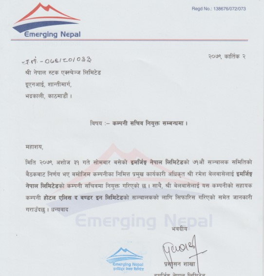 काठमाडौं । इमर्जिङ्ग नेपालको कम्पनी सचिवमा निमित्त प्रमुख कार्यकारी अधिकृत रमेश बेलबासे नियुक्त भएका छन् । कम्पनीको गत असोज ३१ गते बसेको सञ्चालक समितिको बैठकले बेलबासेलाई कम्पनी सचिवमा नियुक्त गरेको जनाएको छ ।