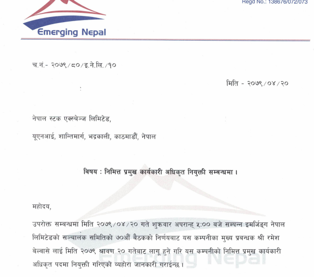 उनलाई साउन २० गतेदेखि लागु हुने गरि निमित्त प्रमुख कार्यकरी अधिकृतमा नियुक्त गर्ने निर्णय गरेको हो । कम्पनीका प्रमुख कार्यकारी अधिकृत शिखर भट्टराईले राजिनामा दिएसँगै उनलाई निमित्त प्रमुख कार्यकरी अधिकृतमा नियुक्त गरेको हो ।