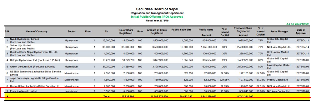 काठमाडौं । इमर्जिङ नेपाल लिमिटेडले आईपीओ निष्काशन तथा विक्रीका लागि नियामक निकाय नेपाल धितोपत्र बोर्डबाट अनुमति पाएको छ । कम्पनीले बोर्डबाट ५ करोड ५५ लाख ६० हजार रुपैयाँ बराबरको ५ लाख ५५ हजार ६०० कित्ता आईपीओ निष्काशनका अनुमति पाएको हो ।