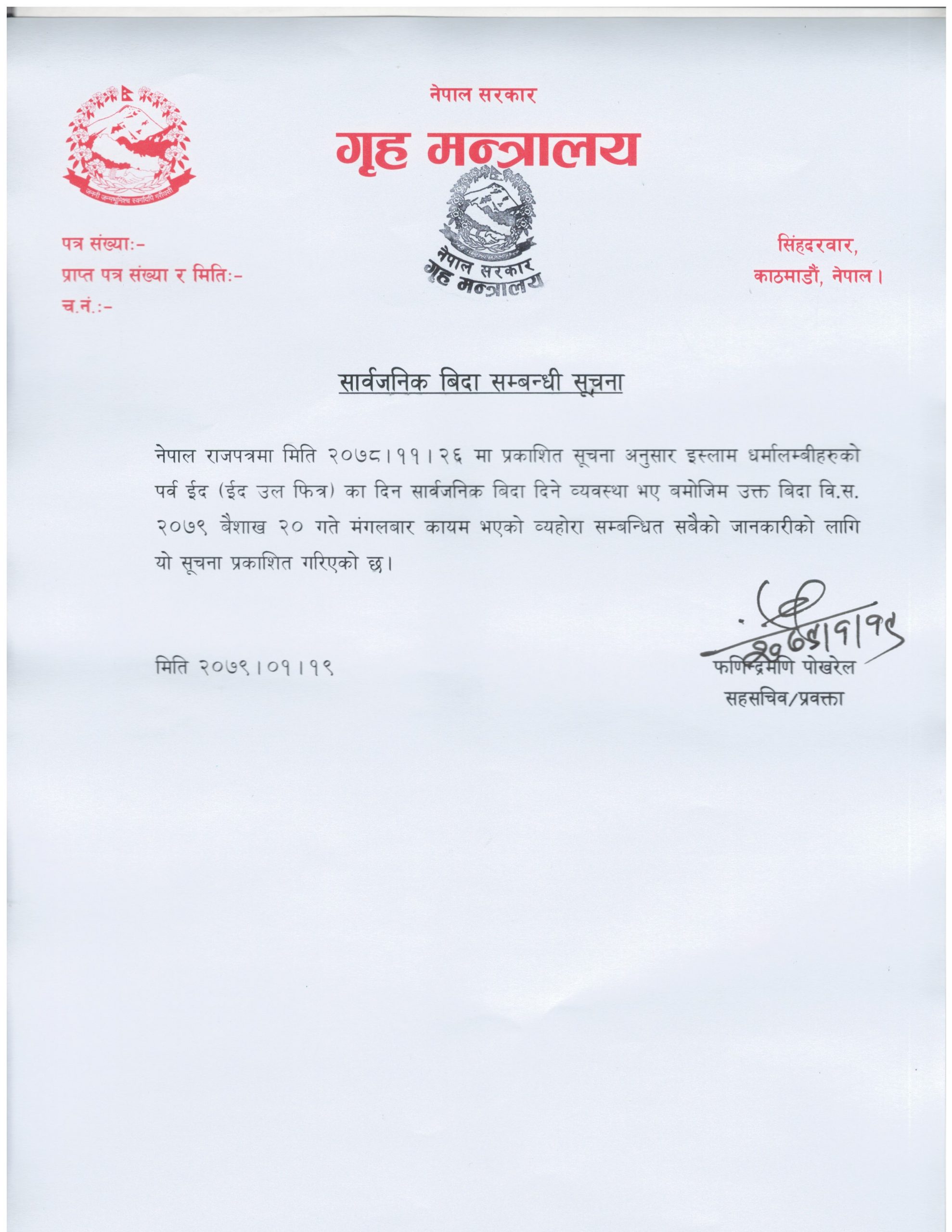 ईदको उपलक्ष्यमा मंगलबार सार्वजनिक बिदा