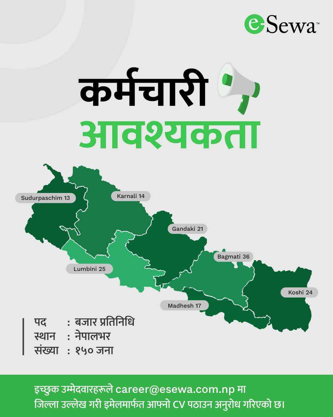 काठमाडौं । ई-सेवा कम्पनीले कर्मचारी माग गरेको छ । कम्पनीले नेपालभरका लागि बजार प्रतिनिधि माग गरेको जनाएको छ । कम्पनीले सो पदमा १५० जना कर्मचारीको लागि दरखास्त आब्हान गरेको हो । ईच्छुक व्यक्तिले कम्पनीको इमेल मार्फत आफ्नो सीभी पठाउन कम्पनीले आग्रह गरेको छ ।