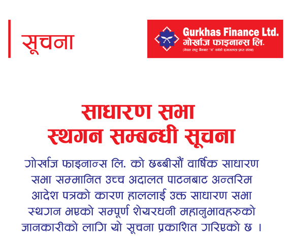 काठमाडौं । आज हुने भनिएको गोर्खाज फाइनान्सको साधारणसभा स्थगन भएको छ । उच्च अदालत पाटनको अन्तरिम आदेशको पत्रका कारण साधारणसभा स्थगन भएको फाइनान्सले जनाएको छ ।