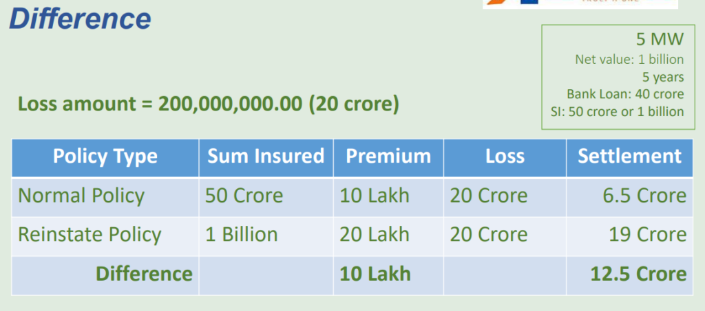 एवन रिइन्स्योरेन्स ब्रोकरले पेश गरेको उदाहरणमा परम्परागत बीमालेखमा १ अर्ब लगानीको जलविद्युत परियोजनाको ५० प्रतिशत ह्रासकट्टी गणना गरेर बीमाङ्क जम्मा ५० करोड रुपैयाँ कायम हुने र वार्षिक १० लाख रुपैयाँ बीमाशुल्क भुक्तानी गर्नुपर्ने अवस्थाको उदाहरण पेश गरिएको थियो । २० करोड रुपैयाँ अनुमानित क्षतिको आधारमा बीमा दाबीवापत प्राप्त हुने रकम गणना गर्दा परम्परागत सम्पत्ती बीमाबाट जलविद्युत आयोजनाले २० करोड क्षतिमा जम्मा ६ करोड ५० लाख रुपैयाँ दाबी प्राप्त गर्ने जनाइएको छ। यसैगरी पुनर्स्थापना बीमालेखमा १ अर्बकै बीमाङ्क कायम रहने भएपनि परम्परागत बीमाको तुलनामा दोब्बर बीमाशुल्क भुक्तानी गर्नुपर्ने उल्लेख गरिएको छ। पुनर्स्थापना बीमामा २० लाख रुपैयाँ बीमाशुल्क भुक्तानी गर्नुपरे पनि २० करोड बराबरको नोक्सानीमा १९ करोड रुपैयाँ दाबी योग्य हुने उदाहरण प्रस्तुत गरिएको थियो ।