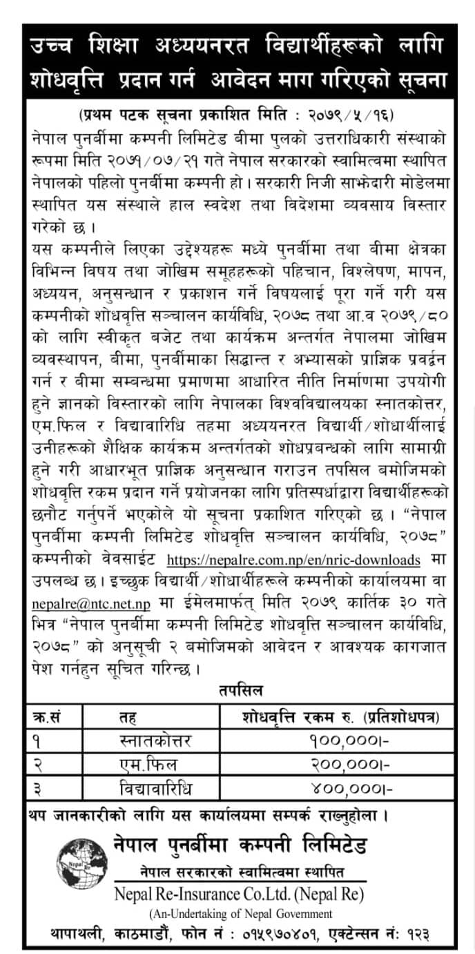 कम्पनीको कार्यविधी तोकिएको वर्षको लागि स्वीकृत बजेट तथा कार्यक्रम अन्तर्गत नेपालमा जोखिम व्यवस्थापन, बीमा, पुनर्बीमाका सिद्धान्त र अभ्यासको प्राज्ञिक प्रवद्र्धन गर्न र बीमा सम्बन्धमा प्रमाणमा आधारित नीति निर्माणमा उपयोगी हुने ज्ञानको विस्तारका लागि नेपालका विश्वविद्यालयका स्नाकोत्तर, एम.फिल र विद्यावारिधि तहमा अभ्ययनरत विद्यार्थी वा शोधार्थीलाई उनीहरुको शैंक्षिक कार्यक्रम अन्तर्गतको शोधप्रबन्धको लागि सामाग्री हुने गरी आधारभुत प्राज्ञिक अनुसन्धान गराउन उक्त रकम प्रदान गर्नका लागि आवेदन माग गरेको जनाएको छ ।