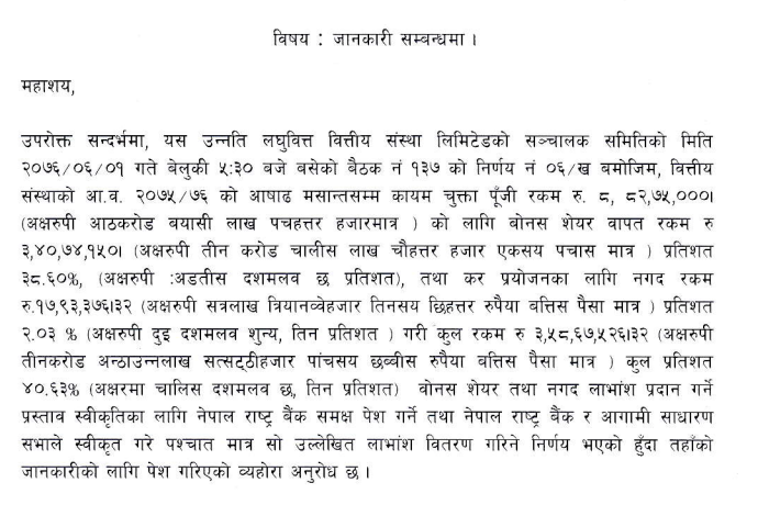 नियामक नेपाल राष्ट्र बैंक र आगामी साधारण सभाले अनुमोदन गरेपछि मात्र लाभांश वितरण गर्ने जनाएको छ ।