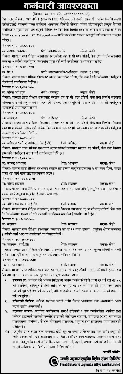 उन्नति सहकार्य लघुवित्तले माग्यो ठुलो संख्यामा कर्मचारी, आवेदन दिन ७ दिन मात्र बाँकि