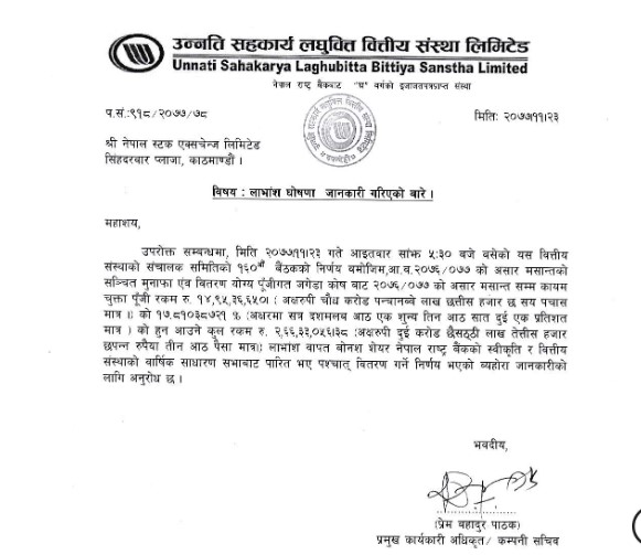काठमाडौं । उन्नति सहकार्य लघुवित्तले १७ दशमलव ८१ प्रतिशत बोनस शेयर दिने भएको छ ।कम्पनीको आइतबार सम्पन्न संचालक समिति बैठकले हाल कायम चुक्ता पुँजीको १७ दशमलव ८१ प्रतिशत बोनस शेयर दिने निर्णय गरेको हो । उक्त बैठकले बोनसमा लाग्ने कर तिर्न नगद लाभांशको प्रस्ताव भने गरेको छैन ।