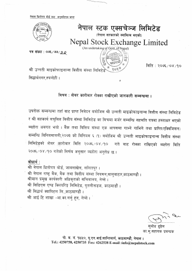 उन्नति माइक्रोफाइनान्सको सेयर कारोबार रोक्का भएको छ । सहकार्य लघुवित्त वित्तीय संस्थासँग मर्जरमा जाने सहमतिपत्रमा हस्ताक्षर गरेपछि आजदेखि सेयर कारोबार रोक्का भएको हो ।