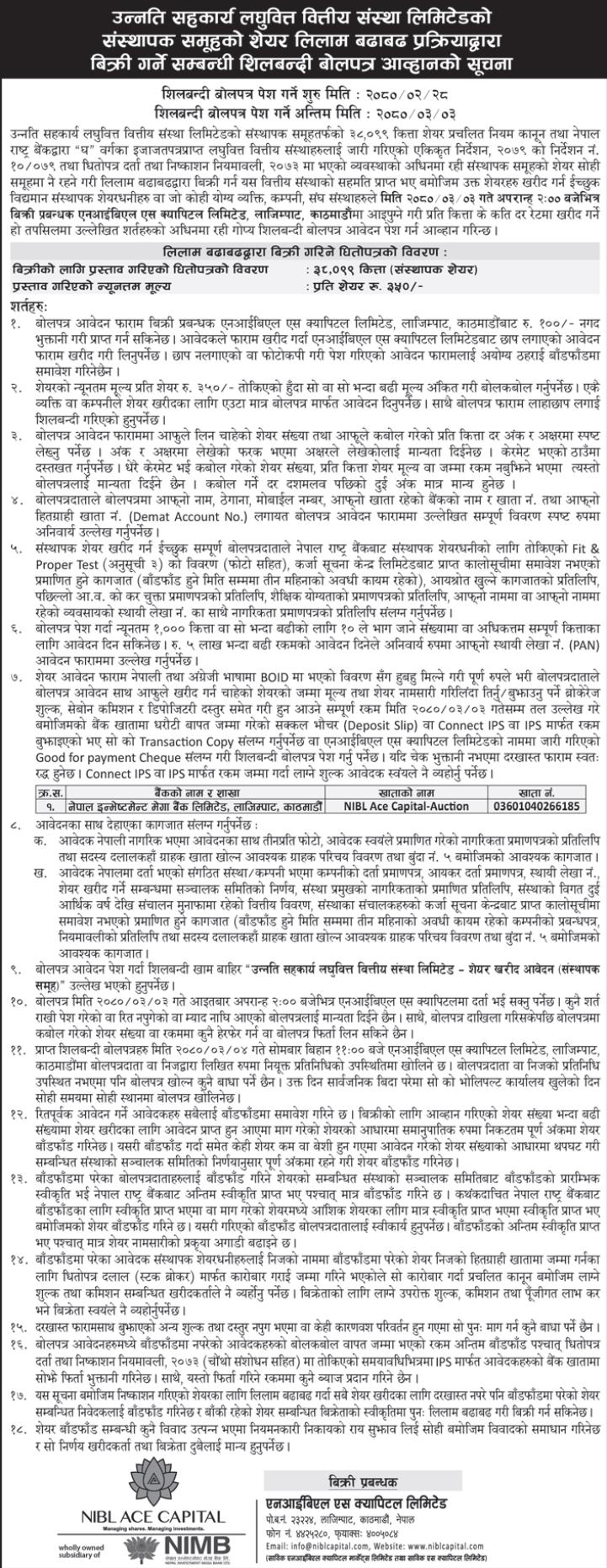 काठमाडौं । उन्नती सहकार्य लघुवित्त वित्तीय संस्था लिमिटेडले ३८ हजार ९९ कित्ता संस्थापक शेयर विक्री गर्ने भएको छ । कम्पनीले उक्त शेयर आजजेठ २८ गतेदेखि विक्रीमा ल्याएको हो । उक्त शेयरमा असार ३ गतेसम्म आवेदन दिन सकिने छ ।