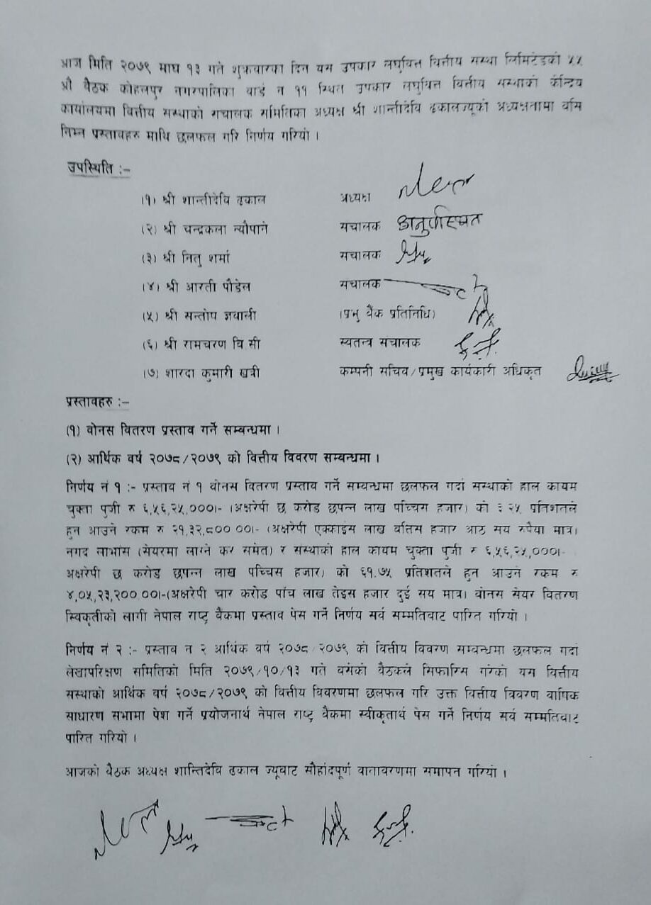 प्रस्तावित लाभांश नेपाल राष्ट्र बैंकमा स्वीकृतिका लागि पेश गर्ने निर्णय गरेको हो । हाल संस्थाको चुक्ता पूँजी ६ करोड ५६ लाख रुपैयाँ रहेको छ । प्रस्तावित बोनस शेयर ४ करोड ५ लाख रुपैयाँ वितरण पूँजी १० करोड ६१ करोड पुग्नेछ । प्रस्तावित लाभांश नेपाल राष्ट्र बैंकबाट स्वीकृत भए पछि मात्रै आगामी वार्षिक साधारणसभामा पेश गर्न सकिनेछ ।