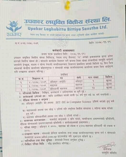 उपकार लघुवित्तले माग्यो १९ जना कर्मचारी, कति चाहिन्छ शैक्षिक योग्यता ?