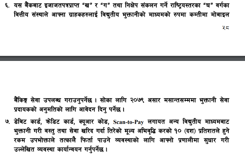 मौद्रिक नीति अन्तर्गत भुक्तानी प्रणाली सुदृढीकरण शीर्षकमा बुँदा नम्बर १३५ मा नेपाल सरकारको बजेटमा उल्लेख भए अनुसार वस्तु तथा सेवाको मूल्य कार्ड वा विद्युतीय माध्यमबाट भुक्तानी गर्दा बिजकमा उल्लेखित मूल्य अभिवृद्धि करको १० प्रतिशत रकम भुक्तानीकर्ताको बैंक खातामा सोझै जम्मा हुने व्यवस्थाको लागि समन्वय गरिनेछ भन्ने उल्लेख छ ।
