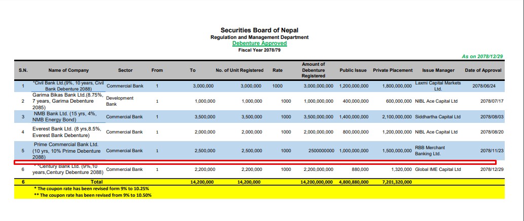 कम्पनीले वार्षिक १०.५० प्रतिशत ब्याजदरमा आगामी १० वर्षको लागि ऋणपत्र निष्काशन गर्नका लाग बोर्डबाट स्वीकृति पाएको हो । बैंकले बोर्डबाट चैत २९ गते ऋणपत्र निष्काशनका लागि अनुमति पाएको हो । विक्री प्रबन्धक ग्लोबल आइएमई क्यापिटल लिमिटेड रहेको छ ।