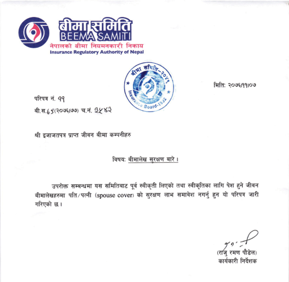 तर, आज समितिले एक परिपत्र जारी गर्दै पती पत्नीको सुरक्षण लाभ समावेश नगर्न जीवन बीमा कम्पनीहरुलाई निर्देशन दिएको छ । बीमा कम्पनीहरुले पहिला नै जारी गरिसकेका बीमालेखहरुको सम्बन्धमा भने समितिले केही खुलाएको छैन् ।
