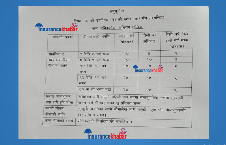 त्यस्तै ८ वर्षदेखि ९ वर्ष अवधिसम्मको बीमालेखको हकमा पहिलो वर्ष १०, दोस्रो वर्ष १० र तेस्रोदेखि बाँकी अवधिका लागि ५ प्रतिशतका दरले कमिशन दिन पाउने प्रस्ताव छ । १० वर्षदेखि १४ वर्ष अवधिसम्मको बीमालेखका हकमा पहिलो वर्ष १५ प्रतिशत, दोस्रो वर्ष १५ प्रतिशत र १० वर्षसम्म ५ प्रतिशतका दरले कमिशन दिन पाउने व्यवस्थाको प्रस्ताव गरिएको छ ।