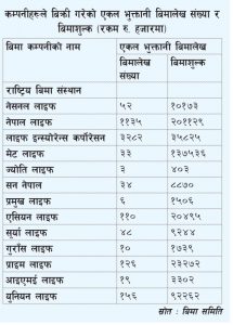 चालू आर्थिक वर्ष ०७४/७५ को पुस मसान्तसम्ममा जीवन बिमा कम्पनीहरूले ५ हजार १४ वटा एकल भुक्तानी जीवन बिमा योजना बिक्री गरेका छन् । बिमा समितिको तथ्यांकअनुसार सो योजना बिक्री गरेबापत कम्पनीहरूले ५४ करोड ५७ लाख रुपैयाँ बिमाशुल्क आम्दानी गरेका छन् ।