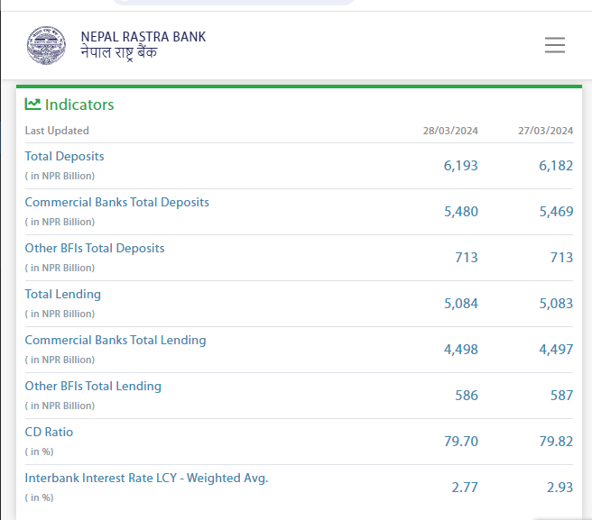 बैंकहरुको औसत सीडी रेसियो घट्दै ७९.७० प्रतिशत कायम भएको छ भने अन्तरबैंक ब्याजदर २.७७ प्रतिशत छ। अघिल्लो दिन सीडी रेसियो ७९.८२ प्रतिशत थियो ।