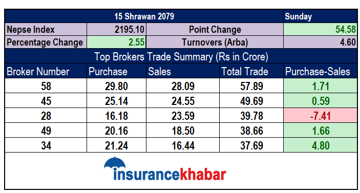 कारोवार गर्ने शिर्ष ५ ब्रोकर मध्ये ४ ब्रोकरले बिक्री भन्दा खरिद धेरै गरेका छन् भने एक ब्रोकरले बिक्री धेरै । आज वित्त बाहेक सबै परिसूचकमा वृद्धि देखिएको छ। लगानी परिसूचक सर्वाधिक वृद्धि हुँदा दोश्रोमा निर्जीवन बीमा समूह रहेको छ । आज जीवन बीमा, निर्जीवन बीमा र लगानी समूहका लगानीकर्ताले सर्वाधिक कमाएका छन्।