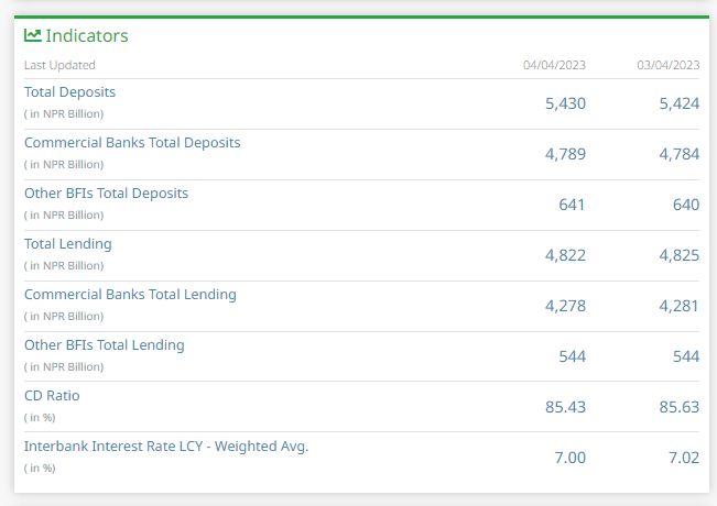 चैत २० गते बैंकिङ प्रणालीमा ५४ खर्ब २४ अर्ब निक्षेप रहेकोमा अर्को दिन अर्थात् चैत २१ गते निक्षेप बढेर ५४ खर्ब ३० अर्ब पुगेको छ । कुल निक्षेपमा वाणिज्य बैंकले संकलन गरेको निक्षेप ४७ खर्ब ८९ अर्ब रहेको छ ।