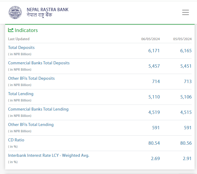 त्यस्तै आइतबारसम्म कर्जा प्रवाह ५१ खर्ब ६ अर्ब रहेकोमा सोमबार ५१ खर्ब १० अर्ब पुगेको हो। एकै दिनमा कर्जा प्रवाह ४ अर्बले वृद्धि भएको छ । सोमबारसम्म वाणिज्य बैंकमा निक्षेप ५४ खर्ब ५७ अर्ब पुगेको छ भने वाणिज्य बैंकबाट ४५ खर्ब १९ अर्ब कर्जा प्रवाह भएको छ ।