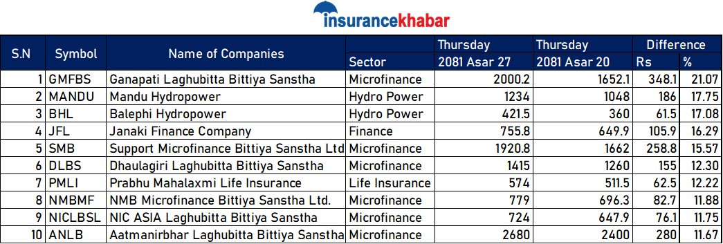 त्यस्तै दोश्रोमा माण्डु हाइड्रोपावरको शेयर मूल्य १७.७५ प्रतिशतले वृद्धि भएको छ । गत साता १०४८ रुपैयाँमा बन्द भएको कम्पनीको बजार मूल्य यो साता १२३४ रुपैयाँमा बजार मूल्य बन्द भएको छ । यो साता कम्पनीको बजार मूल्य प्रति कित्ता १८६ ले बढेको छ ।