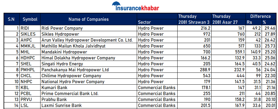 काठमाडौं । आक्रामक रुपमा बजार मुल्य बढेको साता १४ कम्पनीको शेयर मूल्य २० प्रतिशत भन्दा धेरैले वृद्धि भएको छ जसमा १० हाइड्रोपावर कम्पनी रहेका छन् भने ४ वाणिज्य बैंक रहेका छन् ।