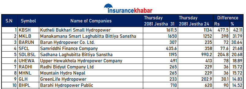 काठमाडौं । यो साता केही कम्पनीको शेयरमा लगानीकर्ताले ४० प्रतिशत भन्दा धेरै कमाएका छन्।