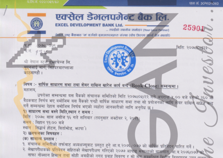 काठमाडौं । एक्सेल डेभलपमेन्ट बैंकले असोज १६ गते साधारण सभा आब्हान गरेको छ । उक्त सभा असोज १६ गते शनिवार बिर्तामोडको सिद्धार्थ होटेलमा गर्ने निर्णय गरेको छ ।
