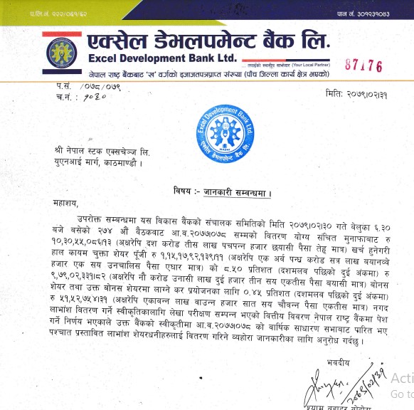 काठमाडौं । एक्सेल डेभलपमेन्ट बैंकले लाभांश प्रस्ताव गरेको छ। कम्पनीको सोमबार बसेको संचालक समितिको बैठकले आर्थिक वर्ष ७७/७८ को मुनाफाबाट आफ्ना शेयरधनीलाई वितरण गर्ने लाभांश प्रस्ताव गरेको हो ।
