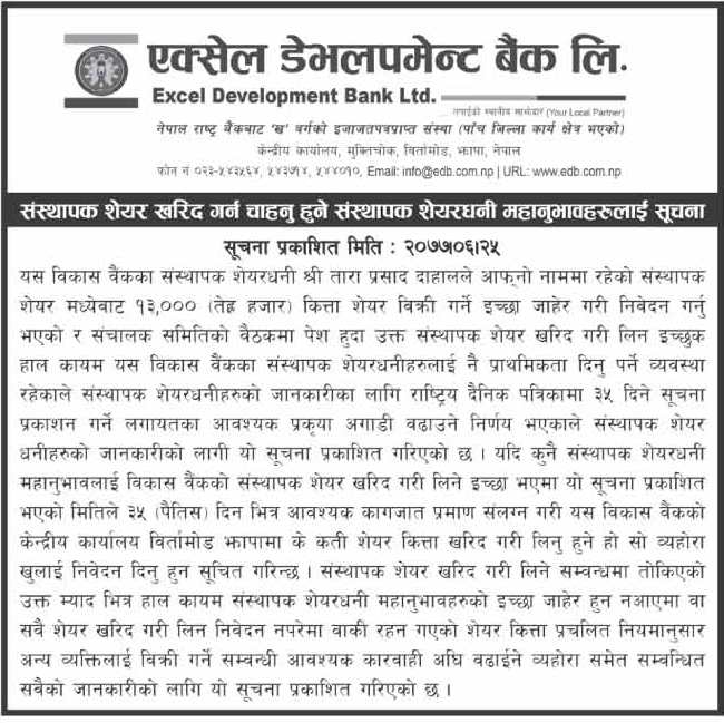 काठमाडौं । एक्सेल डेभलपमेन्ट बैंक लिमिटेडले १३ हजार कित्ता संस्थापक शेयरहरू बिक्री गर्ने भएको छ । बैंकका शेयरधनी तारा प्रसाद दाहलले आफ्नो नाममा रहेको संस्थापक शेयरमध्येबाट १३ हजार कित्ता शेयर विक्री गर्न लागेहो हो ।
